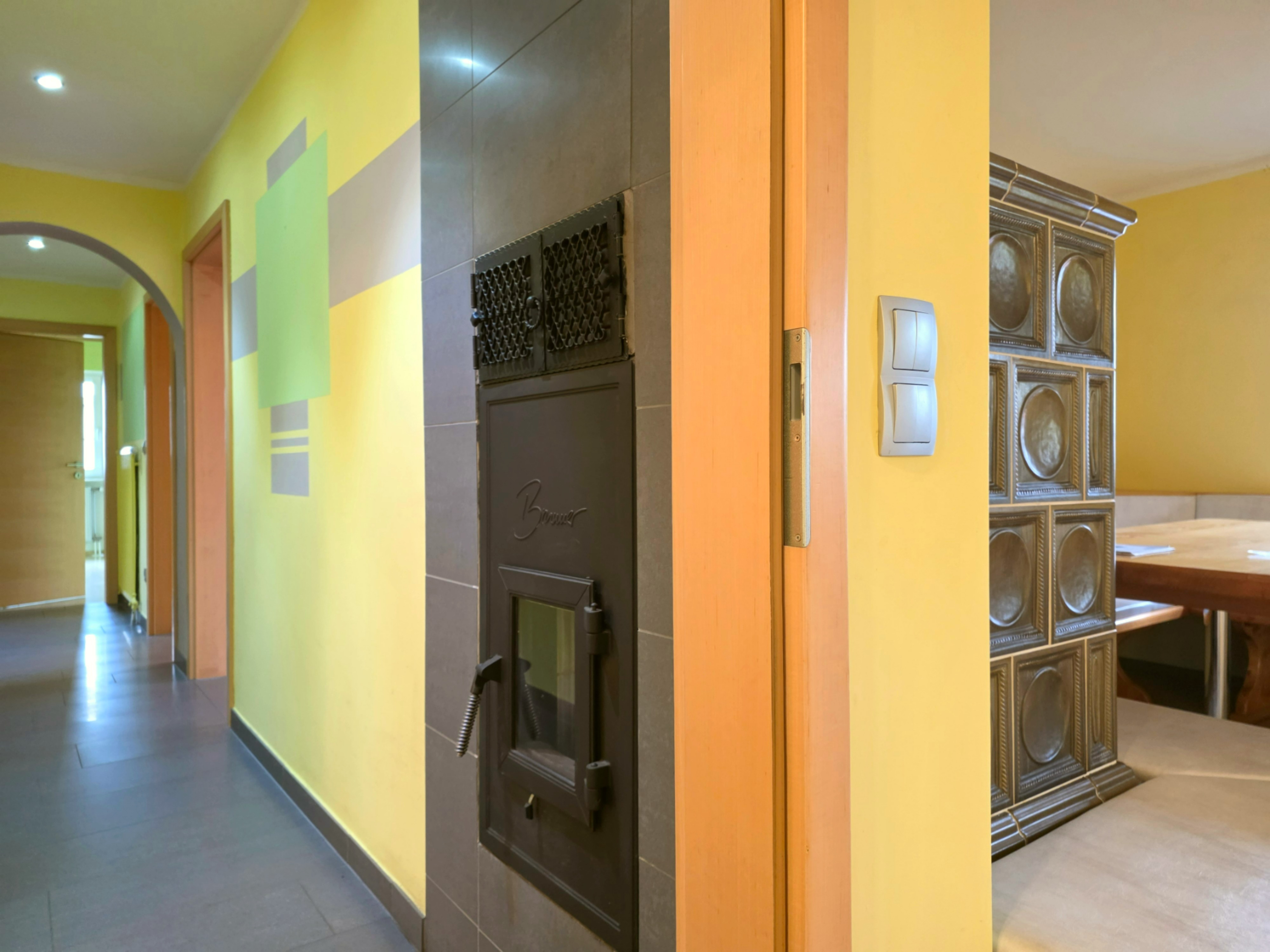 – Heizung & Kamin: Flexibles Kombi-System (Holzheizung und Ölheizung) für den gesamten Heizkreislauf und Warmwasser. Kachelofen (Holz) im Wohnzimmer.