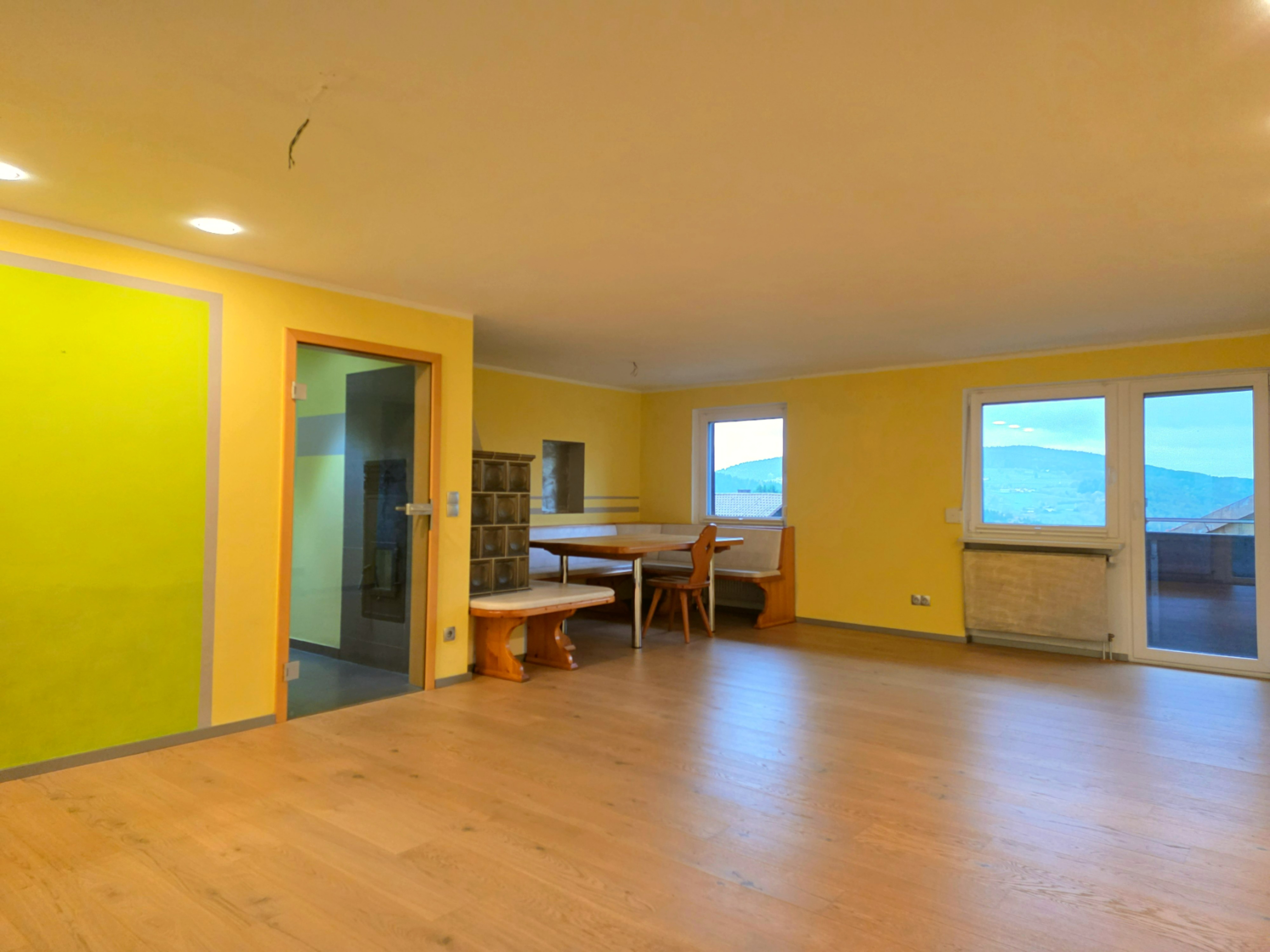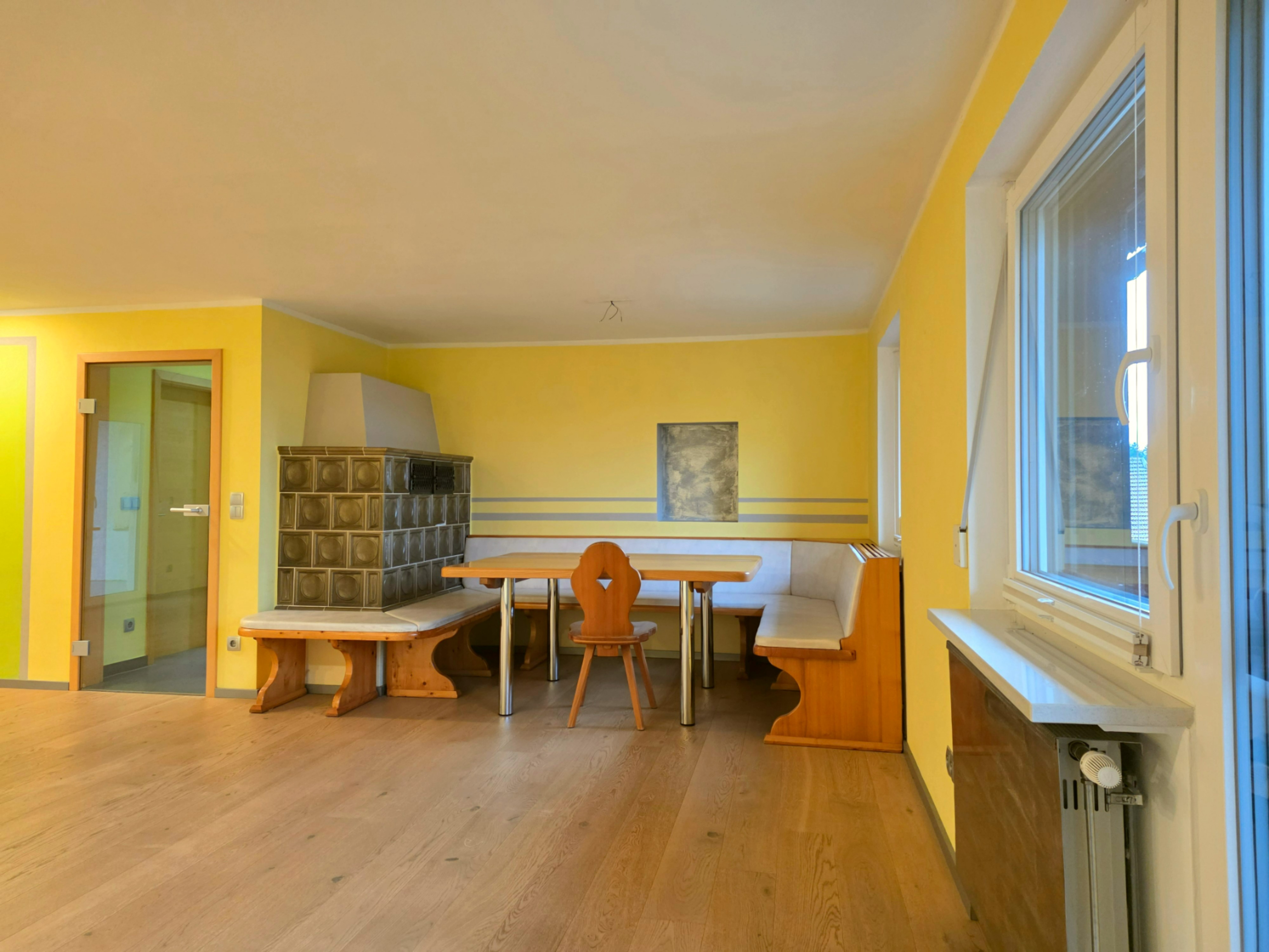 Das Herzstück ist der weite, offene Wohnzimmer- und Essbereich, in dem der Kachelofen fest integriert ist und für wohlige Wärme sorgt, die über die gesamte Wohnebene verteilt wird. Vom Wohnbereich aus haben Sie direkten Zugang zum Balkon sowie zur großflächigen Terrasse. Ein besonderer Komfort ist, dass der Balkon und die Terrasse komplett überdacht sind, was Ihnen geschützte Plätze im Freien bei jedem Wetter garantiert.